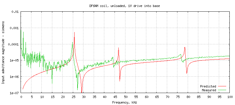 In this test the base of the coil is driven with 1V AC and the drive current is measured to produce an input admittance plot. The test circuit is df6nm_coil-unloaded.spice which contains