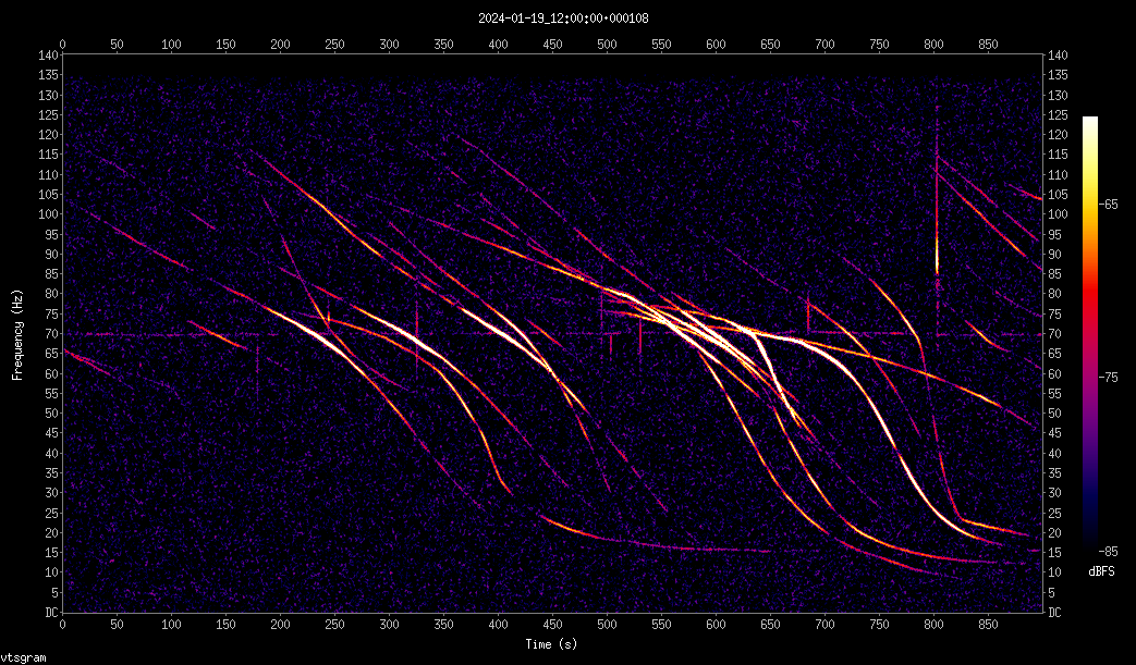vtping is analysing the signal for pings (more details below) and storing the results under /t/pings. vtwrite is recording the stream continuously to disk under /t/p18. Not essential, but it is useful to keep a month or so of data available to examine interesting events more closely. vtspec is displaying the I/Q signal on my screen, and the final command is used when I want to listen to the signal.