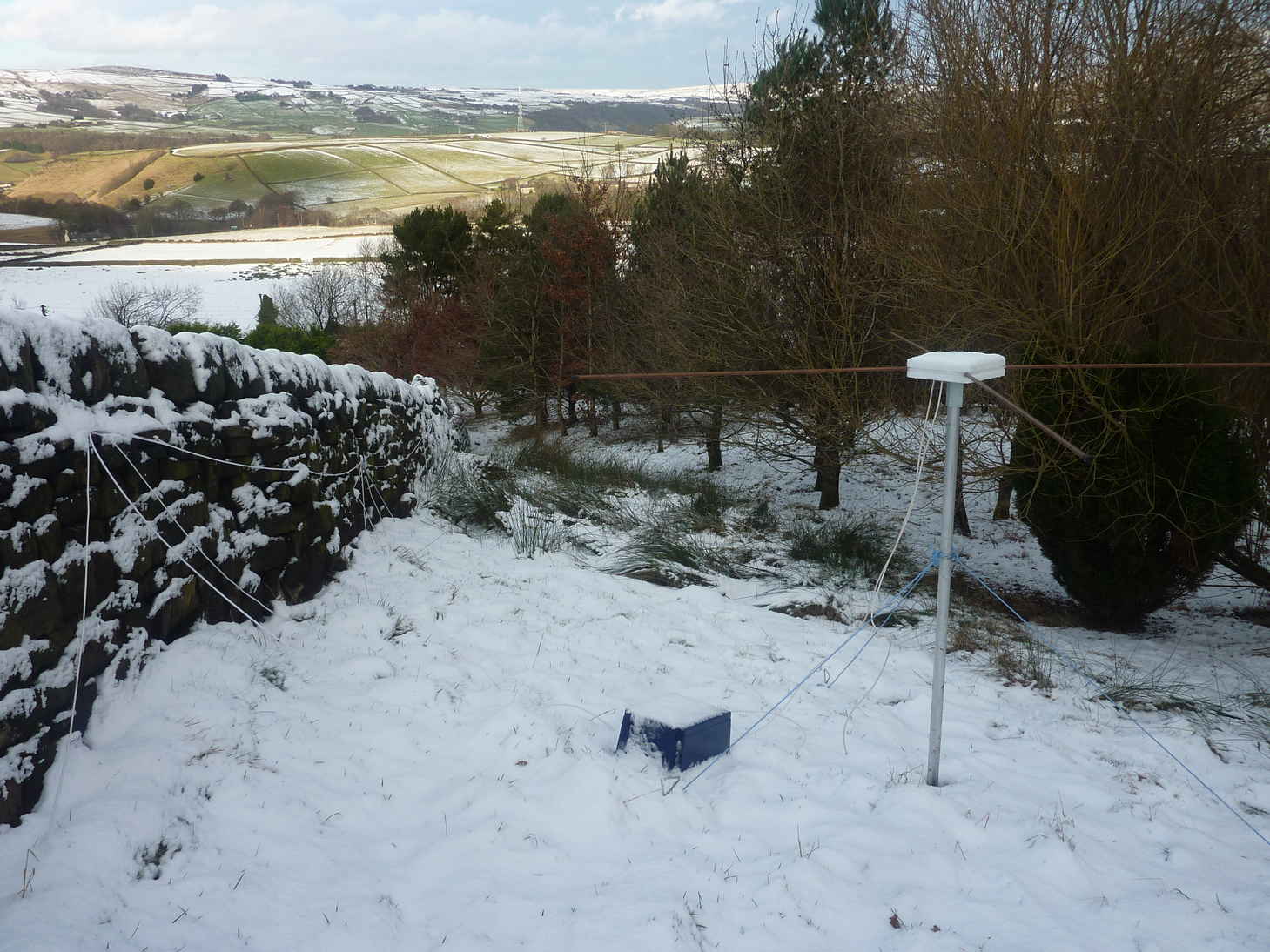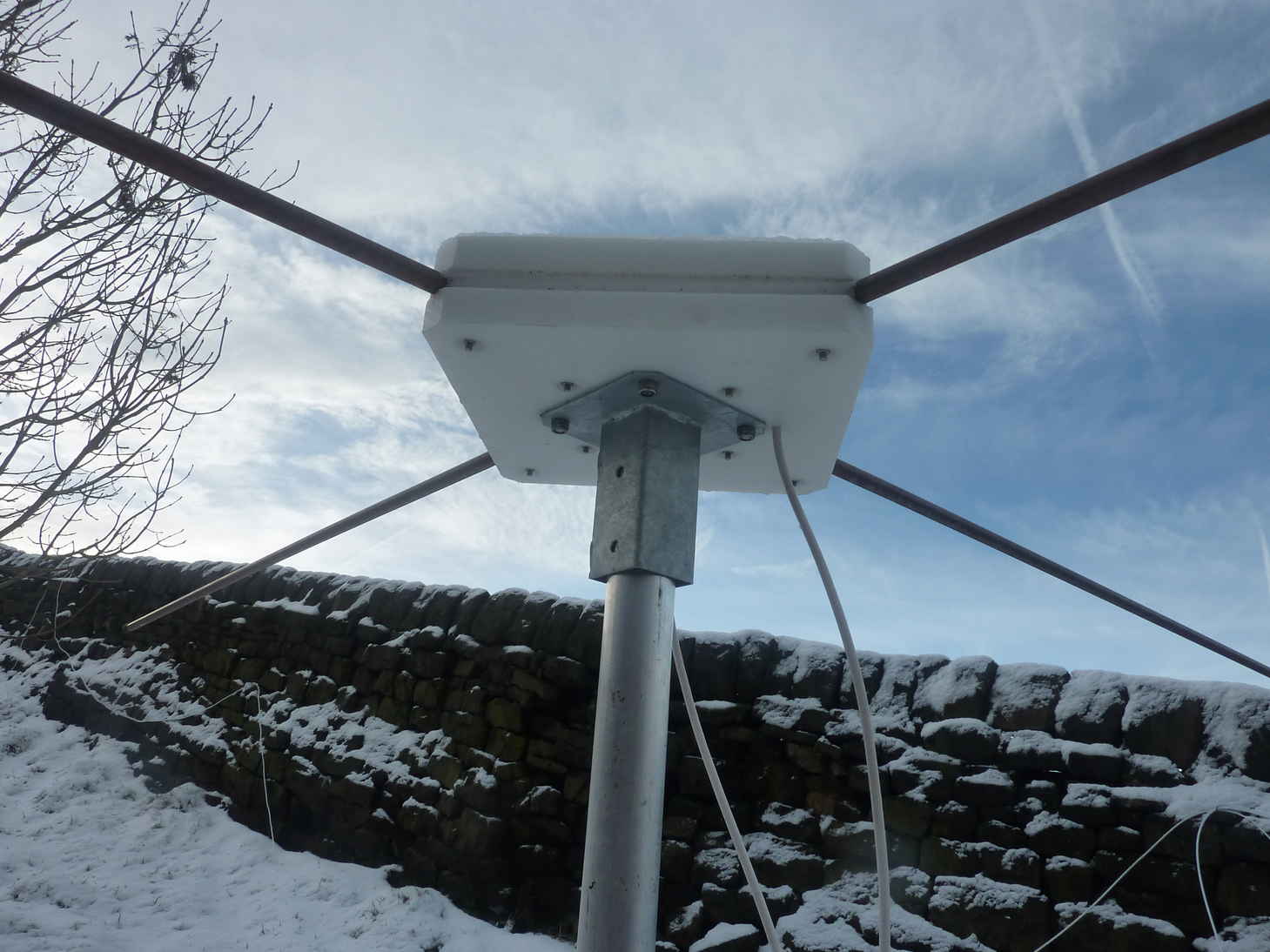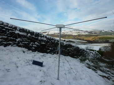 This is a temporary location during testing. The sloping ground significantly distorts the otherwise omni-directional pattern of the axial mode turnstile antenna.