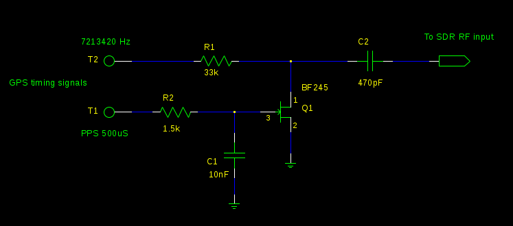 vtubx -P 1,-0.5e-3 -F 2,7213420 /dev/ttyACM0This sets timing output 1 to a negative-going 500uS wide pulse-per-second, and timing output 2 to a constant 7.21342 MHz square wave. The two timing signals with amplitude about 3V are combined in the passive modulator circuit below.
