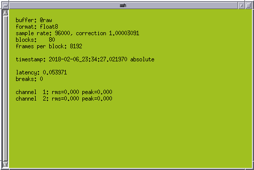 All the channels should be showing rms=0.000 with no input to the card. On the stereo card, channel 1 is the left input, channel 2 is the right input. The 'correction' shown in the vtstat output is the factor by which the actual sample rate differs from the nominal sample rate of 96k/sec. Here, the actual sample rate is 96000 * 1.00003091 = 96002.96736 frames/sec. The timestamp should be counting upwards. If it freezes, it's because vtcard has noticed that the sample rate has drifted too fast for it to measure and it is resetting. It will resume after a minute or two. This shouldn't happen very often, especially once the Pi and audio interface are put into an enclosure.